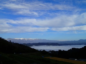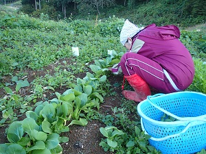 戸隠連峰と雲海を望みながら、お野菜の収穫作業。