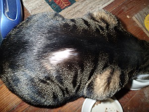 考えていてもしょうがないので猫の病院へ連れて行き、受けた診断は、「虫さされによって痒くなったので、そこをハミハミしているうちに毛もむしってしまったのでしょう」、、とのことでした‼