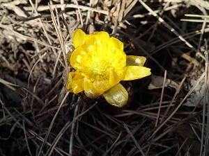 お隣の生垣の下に、今年初めてのフクジュソウが咲いているのを見つけました!