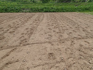 条間1メートル、株間約30センチで種イモを置いていきます。。