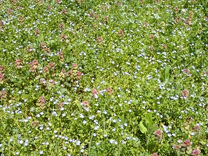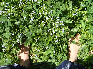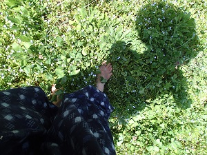 途中、オオイヌノフグリとヒメオドリコソウの草の中で一休み。