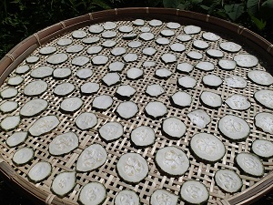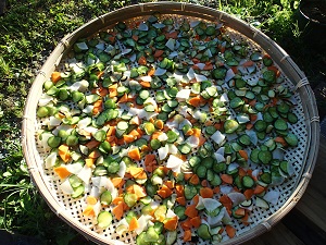 こちらのざるは、自家製福神漬け用に風にあてているお野菜たち。
