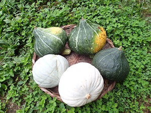 今年は、濃い緑色のカボチャ、淡い緑色のカボチャ、そして白い色のカボチャの3種類を作りました。