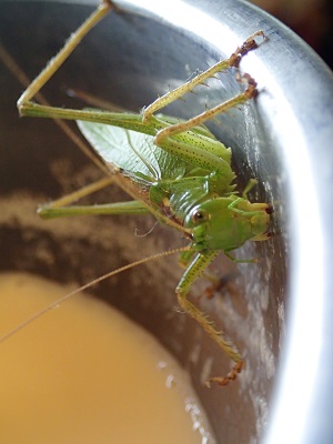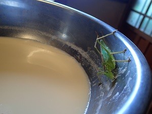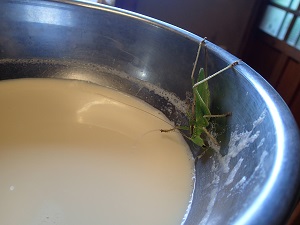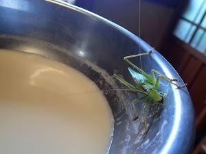 出来たての豆乳の入ったボウルに、スイッチョンが張り付いているではありませんか!