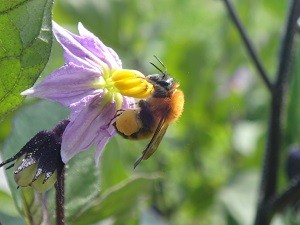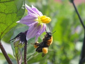 畑にて、、汗だくになっての農作業の手を休め、マルハナバチが花の蜜を吸う姿を観察しました。