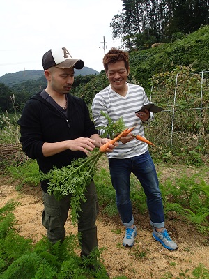 まぎーさんと、「ESQUISSE」http://www.esquissetokyo.com/の村島シェフ、「ラール・エ・ラ・マニエール」http://www.lart.co.jp/の長屋シェフ、そして、リンゴのトクナガさんもご一緒でした。 ニンジン畑にて。。 引きぬいたニンジンを見比べて、談笑する村島シェフと長屋シェフです。