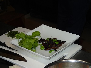 天然の幻のキノコ「香茸」に、枝豆の「秘伝」に、ジャガイモの「インカのめざめ」、、 「香茸は、あく抜きなんかしない方が香りが良くて美味しい!」と、村島シェフ。 ホイルで焼いた香茸に茹でた枝豆を散らし、、、その上に素揚げしたインカのめざめをどさっとかけました。