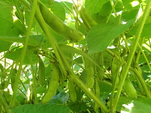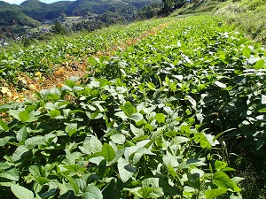 手前が、「さとういらず」。葉が茶色くなって枯れて来ているのは「茶豆」。その向こう側が、「くらかけ大豆」です。