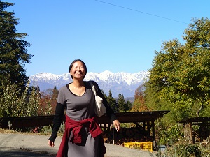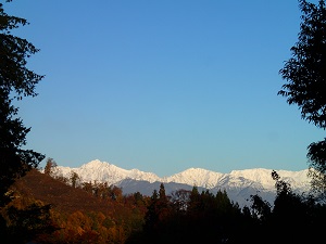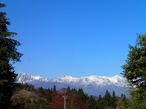 母屋の前から望む白馬三山も雪を被り、美しい。