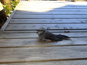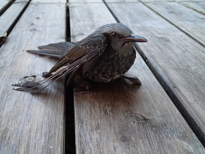 今朝方のこと、、居間の窓の外でコツンと音がして、一羽のヒヨドリがウッドデッキに落ちてきました。。