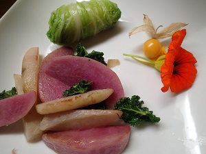 ベジベーコンとアボガド、リンゴの白菜ロール、紅芯大根とトピナンブールとケールのオリーブソテー、食用ホオズキ、のらサラダ、根菜のオーブン焼き、ピオーネのロータルト、、