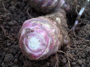 泥の中から、淡い赤紫色のお芋がコロンコロンと転がり出て来るのですが、その色がとても美しくて、、、まるで、バラの花の固い蕾の様です・・・。