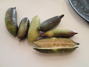 半透明のキャビアやとんぶりのようなプチプチした食材は、「フィンガーライム」という皮がサンショウの香りで実がプチプチ食感のとてもユニークなフルーツなのですって!