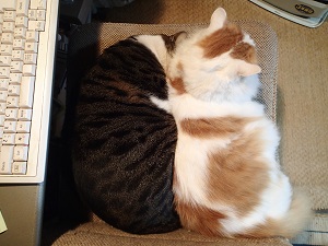 農楽母さんのパソ椅子には、尻尾の生えた子どもたちが二人居座っておりました。これが1人であれば、グイッとお尻で詰めて半ば無理やり半分のスペースを確保するのですが、この状態ではどうしようもありません、、、