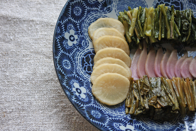 ピンク色のお漬物は、野沢菜の蕪漬けです。