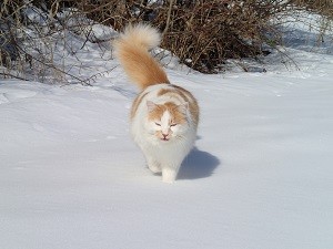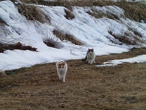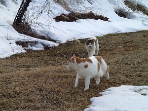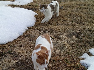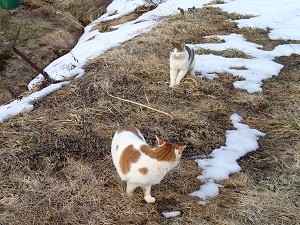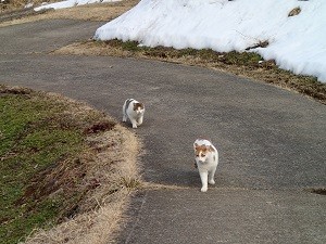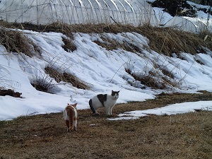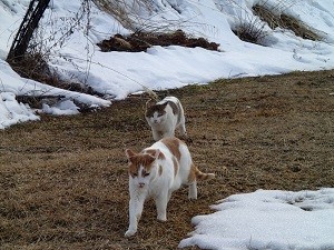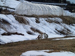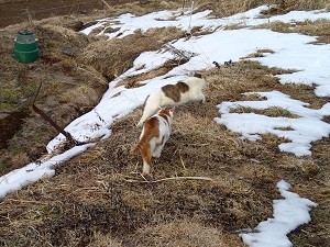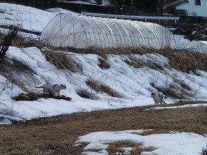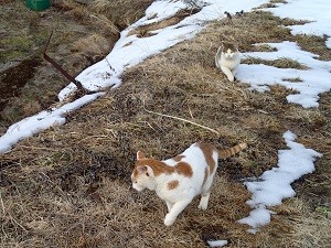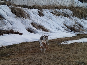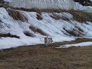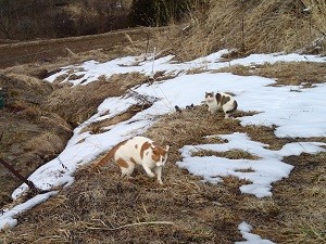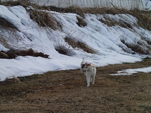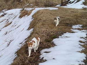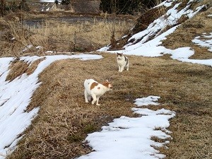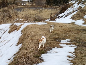 まだ雪の残る棚田の中を、「チャイー」と叫びながら一緒に歩きます。。(ミコ太は、「ウニャアー」!)この写真は昨日のこと。