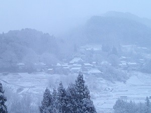 今朝6時、居間の窓から望むお向かいの米田和集落の雪景色です。
