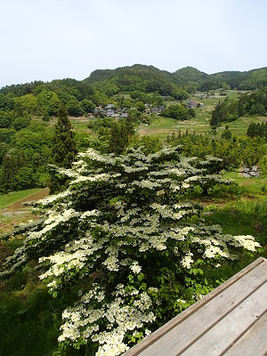 農楽里ファーム母屋の北側、ウッドデッキのすぐそばに咲いているヤブデマリの花が満開となっています!