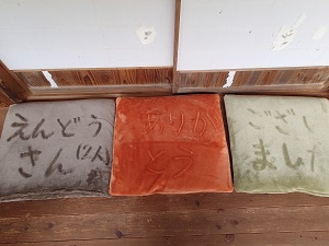 廊下に並べた座布団に、指で「えんどうさんありがとうございました」と、書き残してあったのです!!