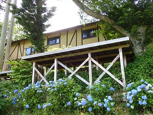 ブルーベリーを摘んでの帰り道、、母屋を見上げますと、紫陽花がきれいに咲いていました!農楽母さんの大好きな水色です!