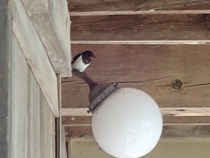 農楽里ファーム母屋の玄関灯にとまるオスツバメ、、