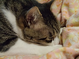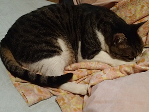 少し涼しいせいでしょうか、チビ太が農楽母さんの布団の上にやってきました。。そして、パジャマの上でフミフミモミモミ開始、、