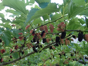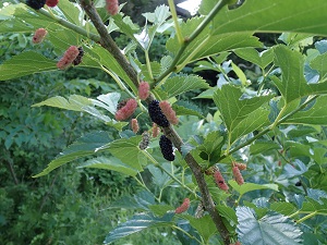小さな畑の隅っこにある桑の木に、完熟の実がたくさんなっていました!