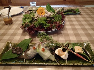 前菜は、手作りの柚餅子に、生春巻き。リーフレタスにベジベーコンとアボガド、パクチー入りです!辛味ソースは、大岡診療所のドクター考案のタマネギと赤トウガラシたっぷりのソースです!