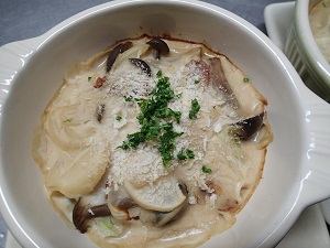 自家製豆乳の、みやまこかぶとハタケシメジのグラタン。