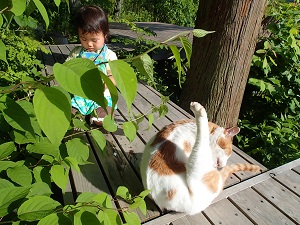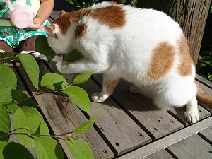 時々、集落の他の子たち(注:ネコ)も遊びに来てはハミハミしていますので、さながらこのウッドデッキは、猫たちのマタタビサロンとでもいう場になっているのではないでしょうか??