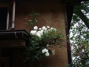 café玄関横のバラの花も咲き始めていました!この白いバラは、プロスペリティーさんです。