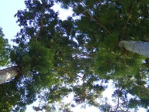 ウッドデッキに寝転んで、対になって立っている高い杉の木を見上げます。