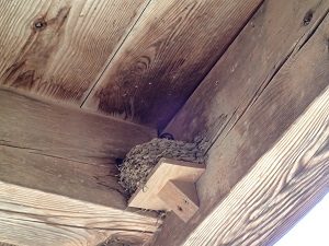 5月半ば、、農楽里ファーム母屋の玄関前にツバメのつがいが巣をつくってくれました。