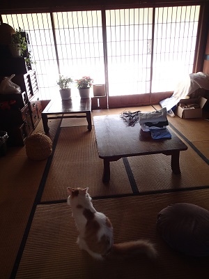 ネコ玄関のある和室では、ミコ太がポケーッと外のほうを向いています。。