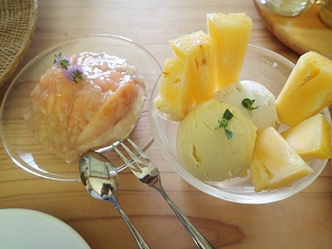 本日のスイーツは、桃のタルトと、塩パインアイス&塩バニラアイス!