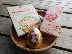 前回は猫のマトリョーショカをお土産に下さったのですが、今回は、シベリアの松の実と松の実オイルをお持ちくださいました!