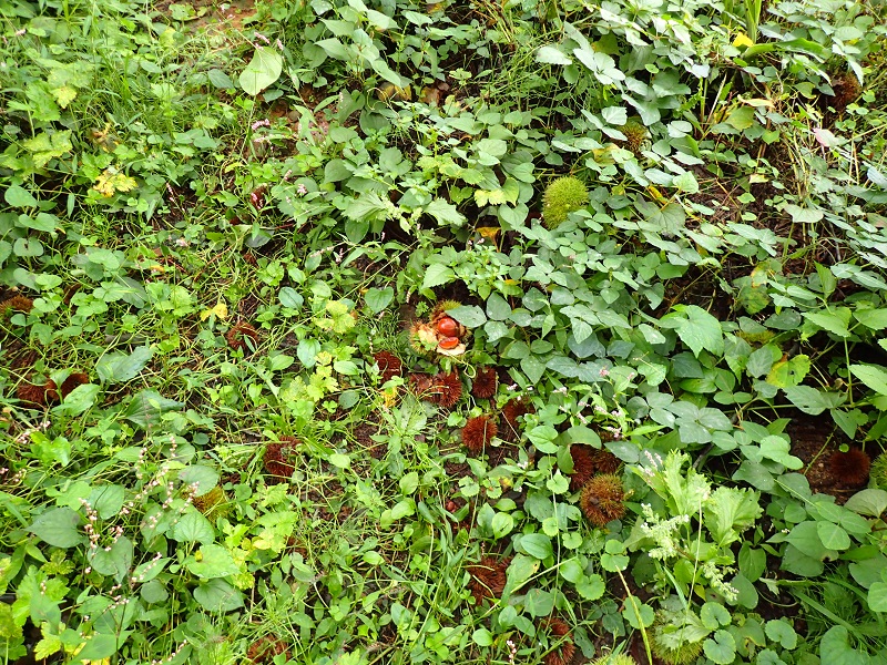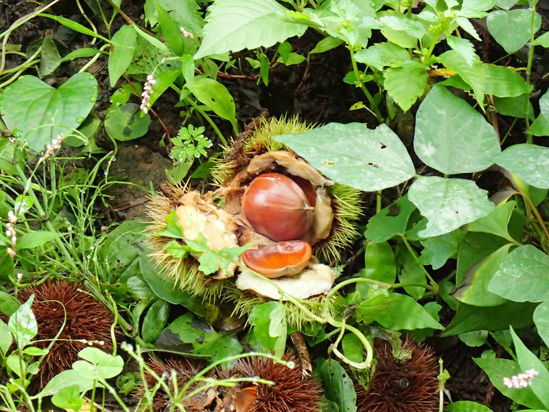 農楽里ファーム母屋の裏にそびえます、樹齢百数十年の大きな栗の樹の栗の実が落ち始めました。高い枝から落ちてきますので、バシッバシッと、大きな音が屋根に響いています。