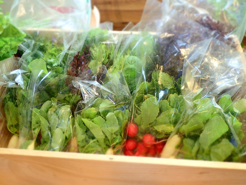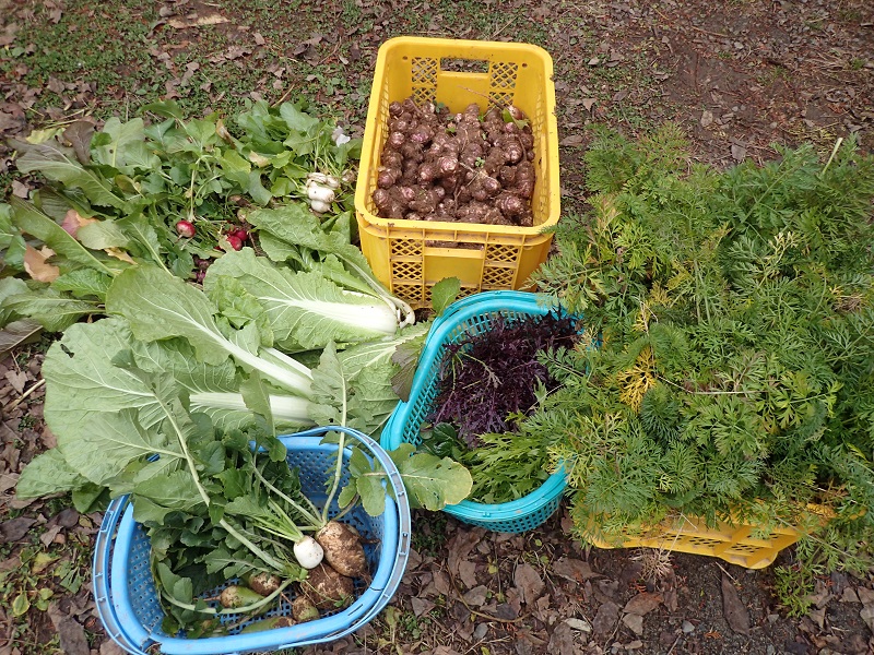 ジャガイモ、トピナンブール、大根各種、白菜、葉付きニンジン、水菜、赤水菜などリーフレタスミックス、ラディッシュ、野沢菜の間引き菜などなど、、