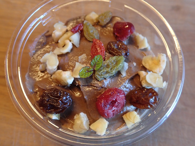 ローチョコレートムースには、ラムレーズン、クルミ、グリーンレーズン、クランベリー、ゴジベリーを、、