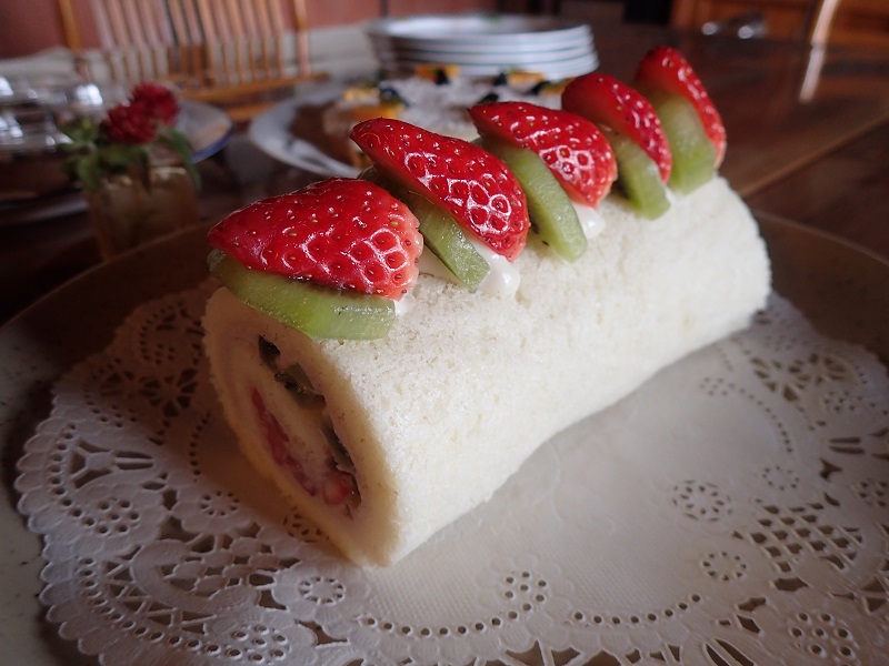 タンボロッジ大屋さんに教えて頂きました米粉のロールケーキには、お豆腐とイチゴを使いましたクリームに、イチゴとキウイをサンドしました。