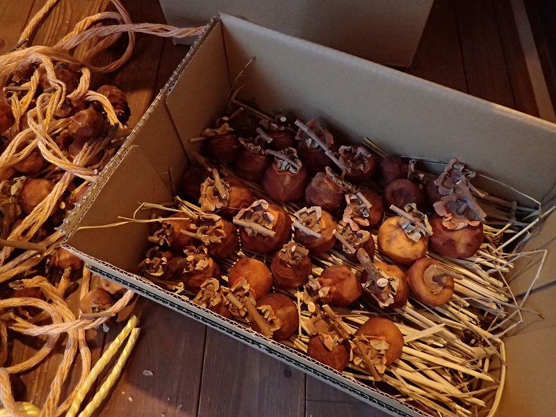 軒下に下げていた干し柿ですが、渋が抜けましたので稲わらを敷き詰めた段ボール箱に入れて少しの間寝かせてみます。