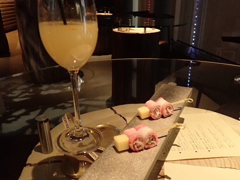 ノンアルコールのリンゴのカクテルと、生ハムには、トマトとコリアンダーが巻いてありました。。