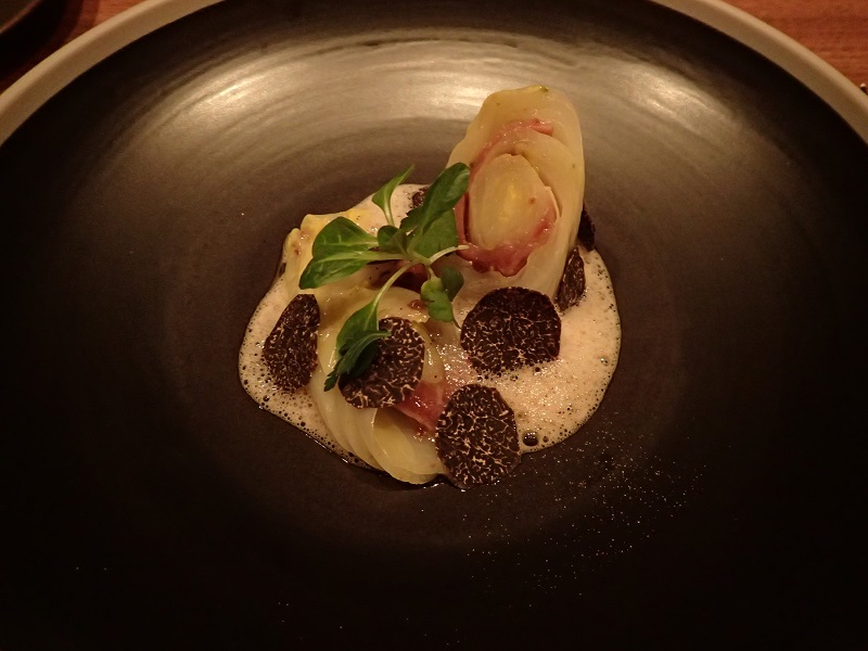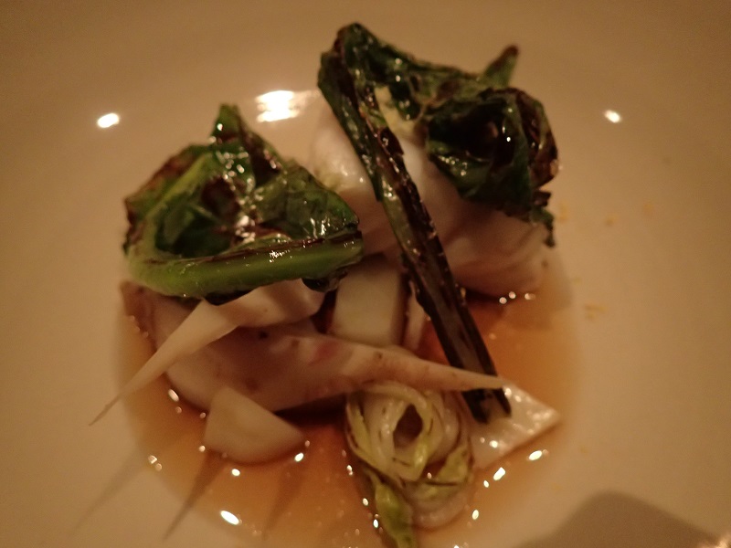 こちらは、クエと野沢菜、トピナンブール、縮みホウレンソウのお料理です。
