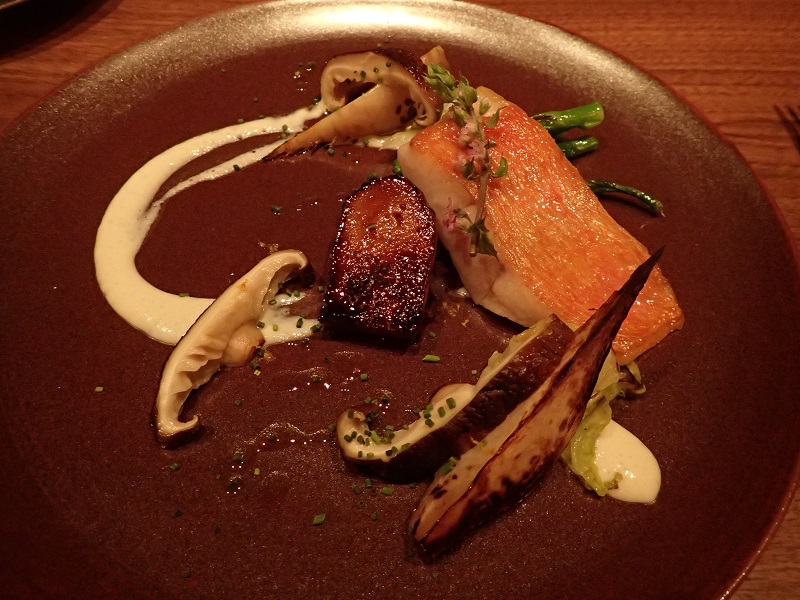 キンメダイと野沢菜、トピナンブールのお料理です。