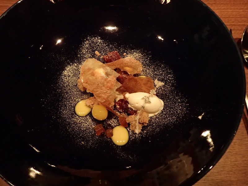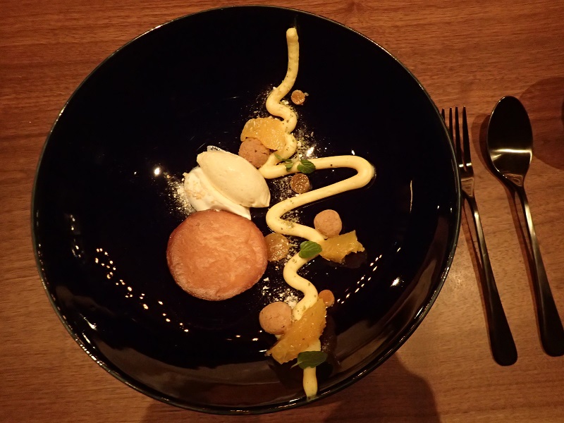 デザートは、濃紺のプレートに盛られていて、深海をイメージしているのだそう、、紅マドンナを使ったクリームがとても美味しかった!