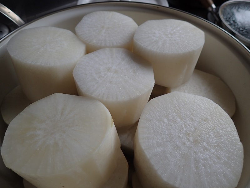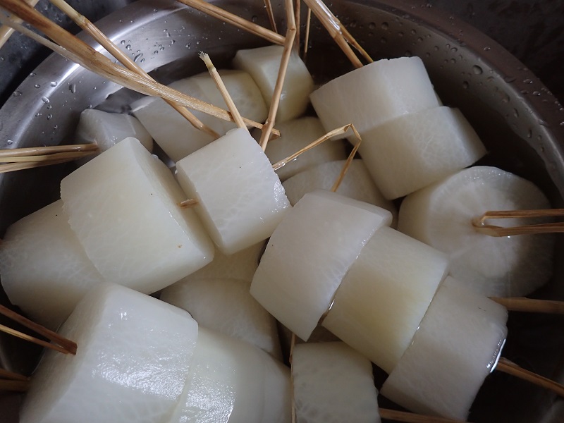 大根を3から4センチの厚さの輪切りにして、外皮をむき、蒸し器で蒸します。