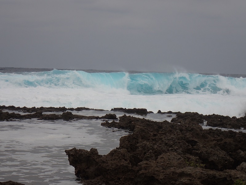 波はとても荒々しく、でも小雨交じりの曇天でも海の青色はきれいでした!