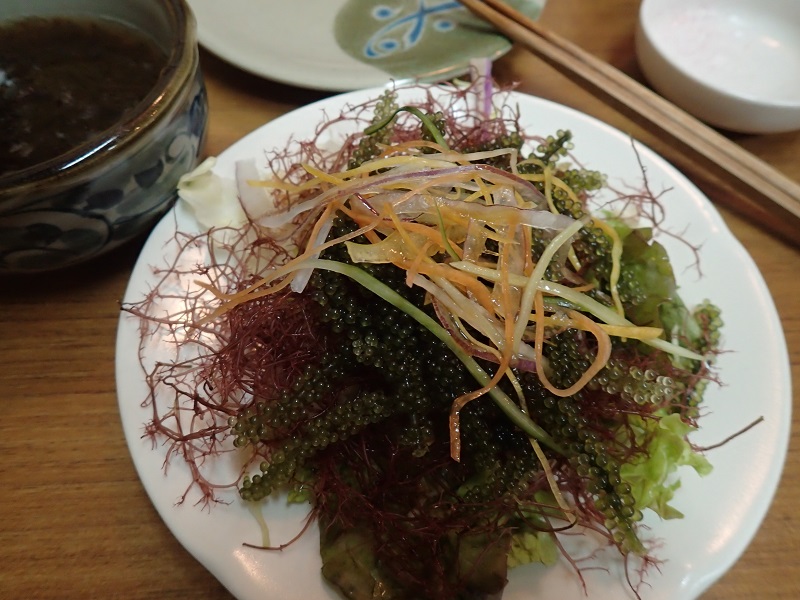 久米島の海洋深層水で養殖された海ブドウのサラダ、、