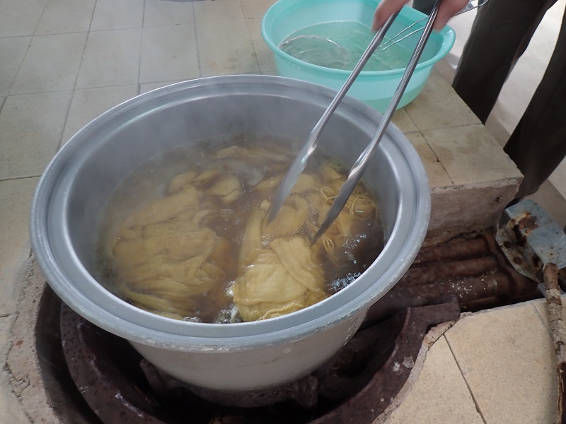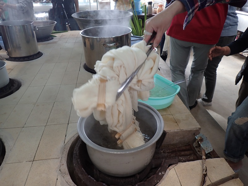 織りあげた反物を折りたたみ綿布に包んで杵で打ち付けます。叩かれることでつやと風合いが増すのだそうです。