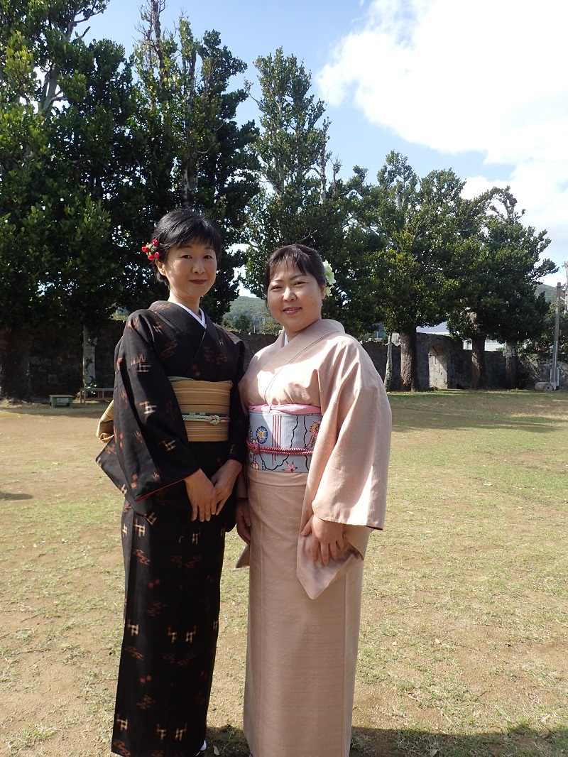 農楽母さんは泥染の着物を、田村さんは月桃で染めた淡い桃色の着物を着せて頂きましたです!!
